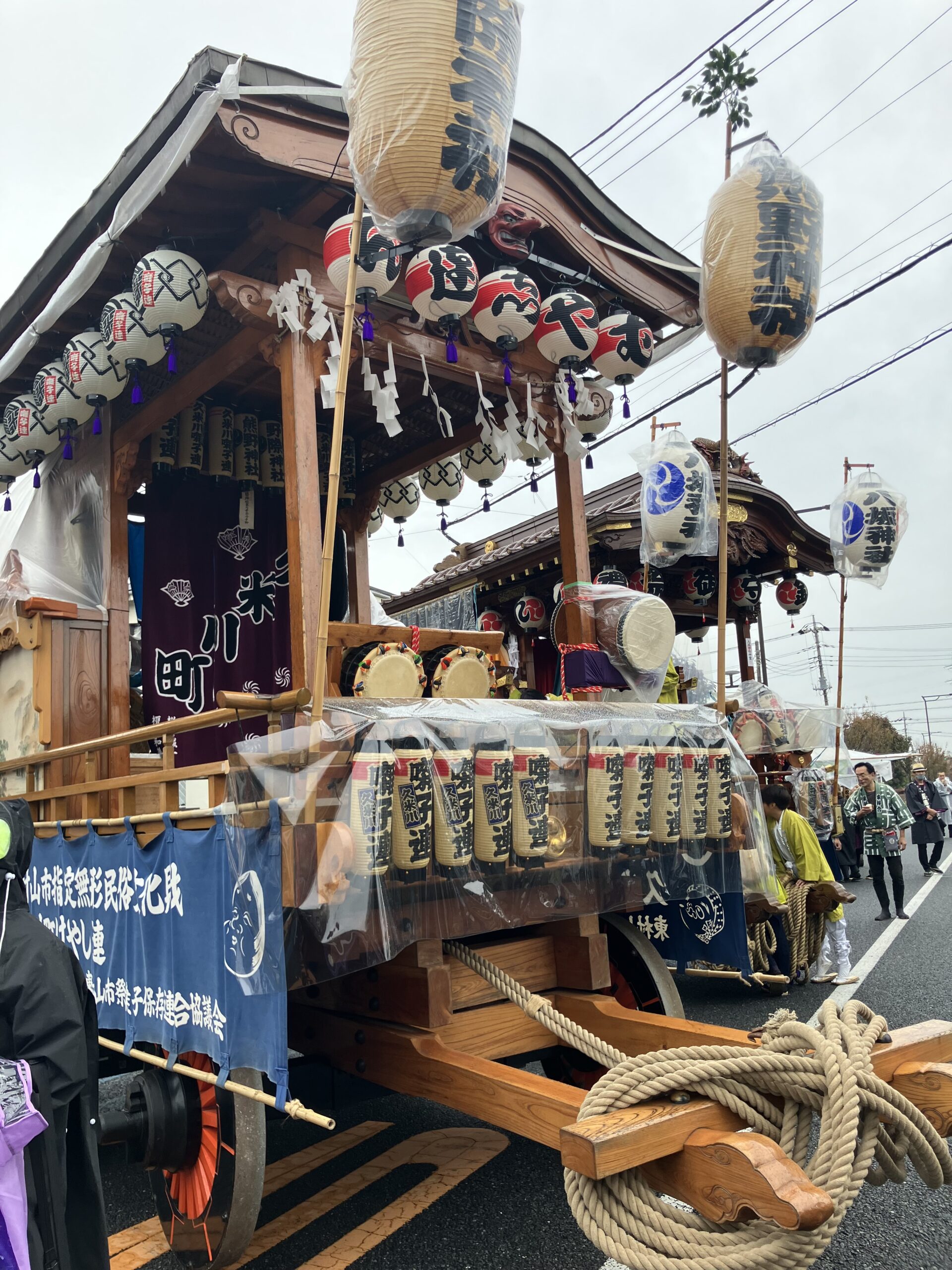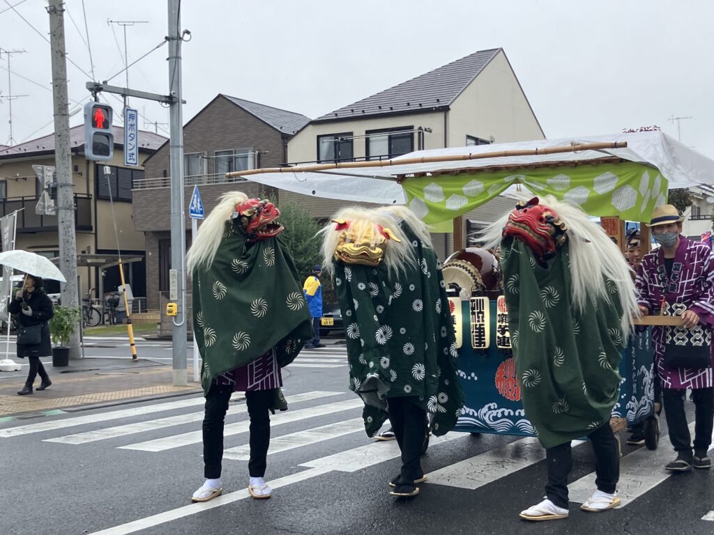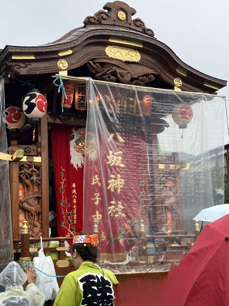 9日は雨模様でしたが、地域の神社の山車が事務所近くの桜通りを練り歩きました。